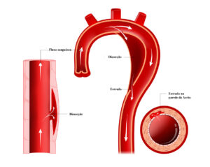 É uma das situações mais críticas. A dissecção ocorre quando há uma ruptura na camada interna da aorta, formando um falso canal de sangue entre as camadas da artéria.