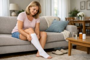 Quando indicadas, as meias de compressão auxiliam o retorno venoso e podem reduzir significativamente a sensação de peso e cansaço nas pernas.